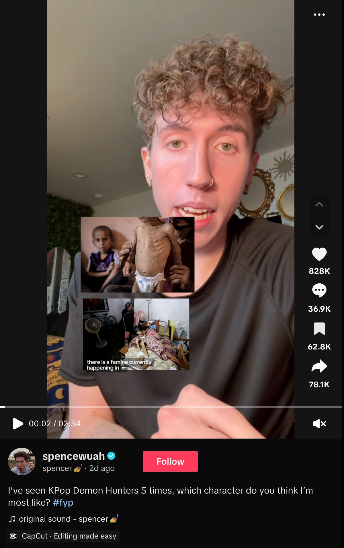 Creator Spencer made a video about how Gaza is in a state of mass starvation. (2.4 million views)