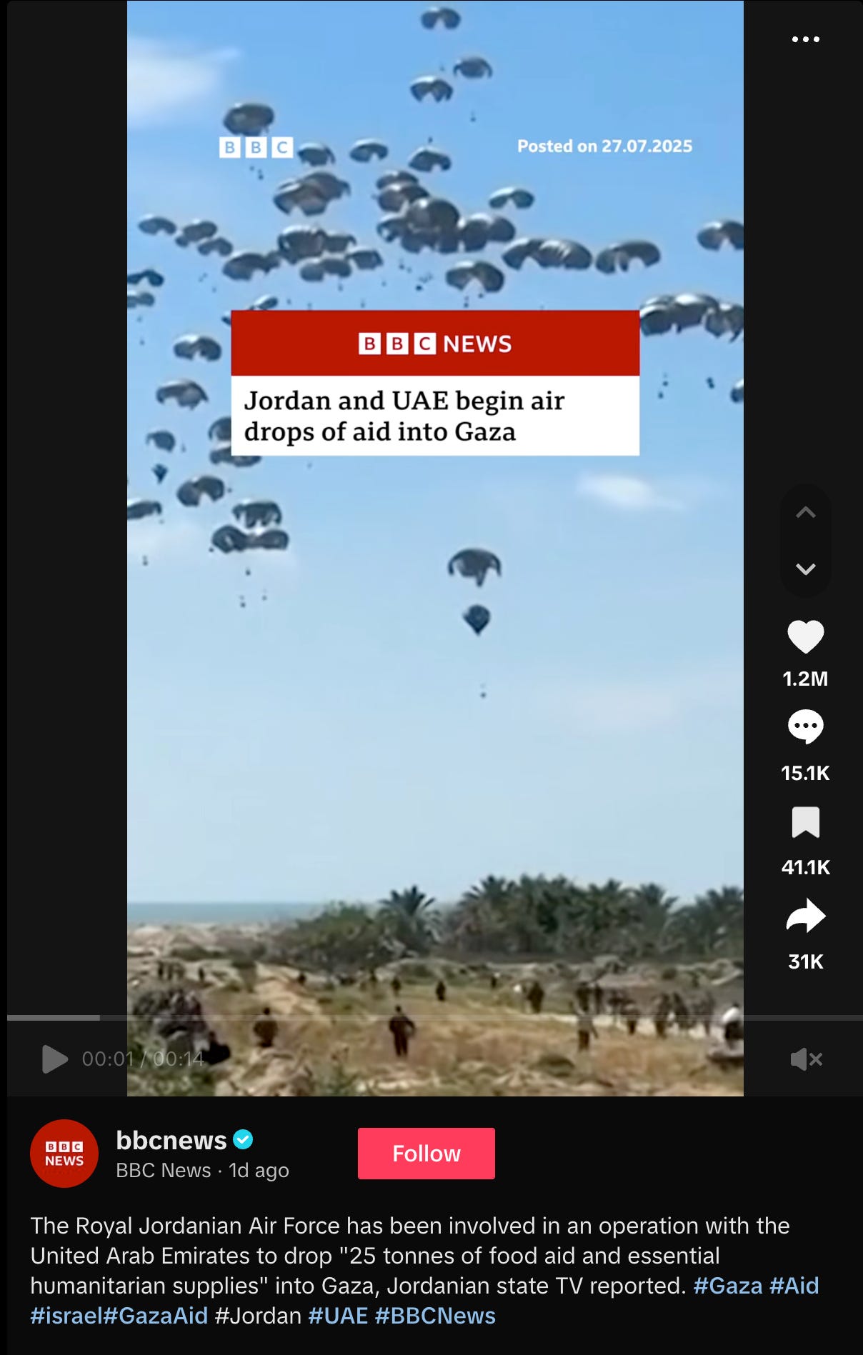BBC News shared clips of Jordan and the UAE air drops of aid into Gaza. (8.8 million views, 7x average views)