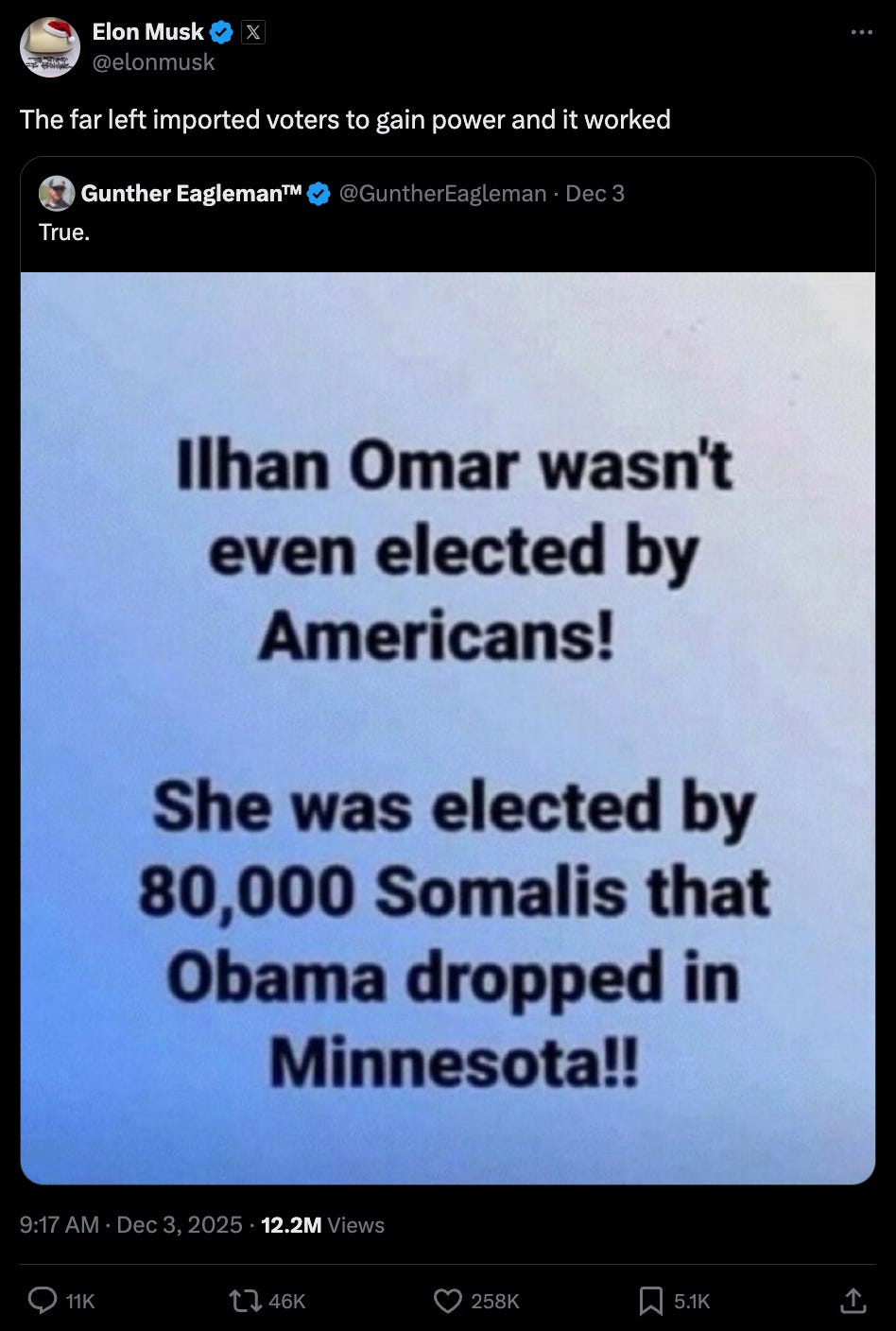 Elon Musk amplified a tweet that suggested Ilhan Omar “wasn’t even elected by Americans,” adding “the far left imported voters to gain power and it worked” (258,000 likes, 5x average engagements)