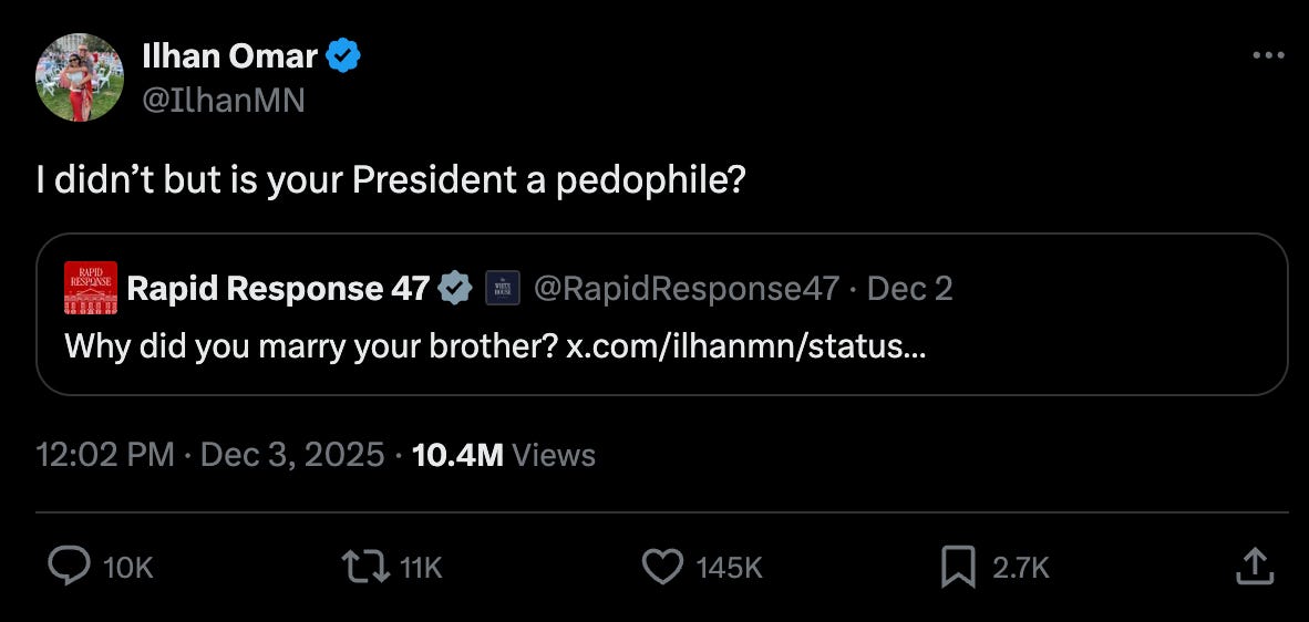 Rep. Ilhan Omar responded to the Trump administration’s rapid response account’s question of whether or not she married her brother with “I didn’t, but is your President a pedophile?” (145,000 likes, 5x average engagements)