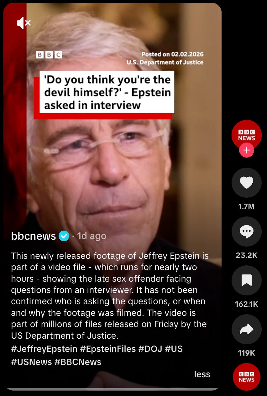 BBC News shared newly released footage where Epstein is asked directly if he’s the “devil himself?” (26.4 million views, 15x average likes)