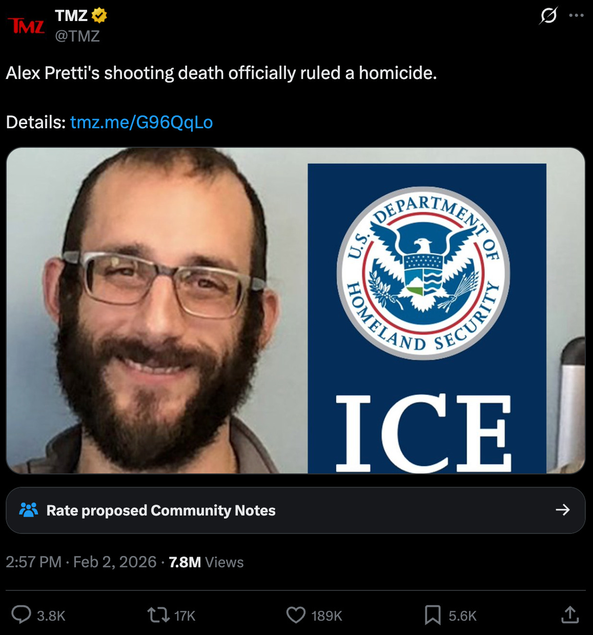TMZ posted about Alex Pretti’s killing being ruled a homicide by the Hennepin County medical examiner. (189,000 likes, 145x average engagements)